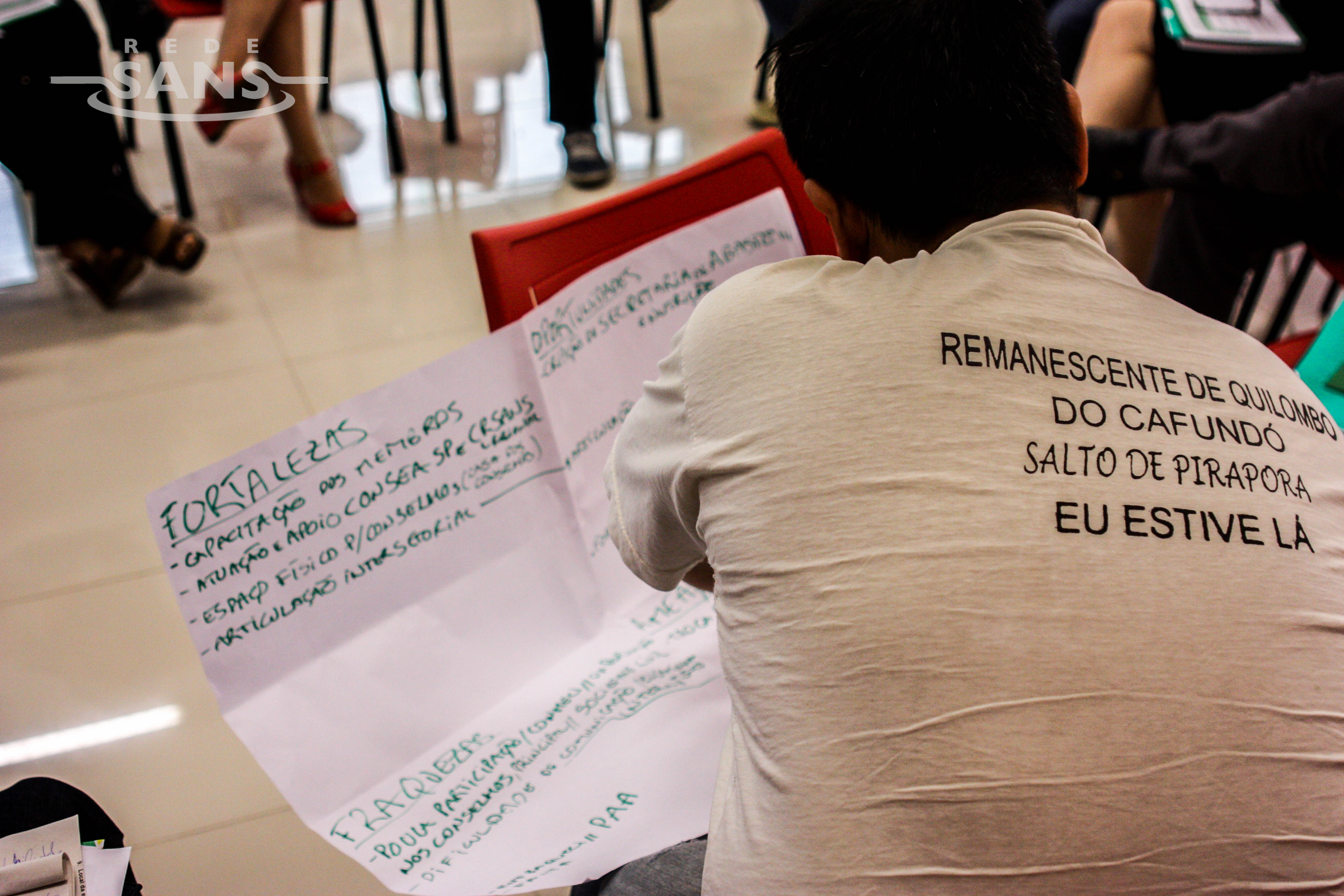 Os grupos em Sorocaba dividiram-se para avaliar a situação de seus municípios. Os representantes se reuniram de acordo com a fase de adesão de suas cidades, entre formação de conselho, ativação do conselho e formação da CAISAN para a adesão. Cada grupo discutiu durante alguns minutos os pontos negativos e positivos da organização de seus municípios para depois discutirem com os presentes as necessidades para efetivar a adesão.