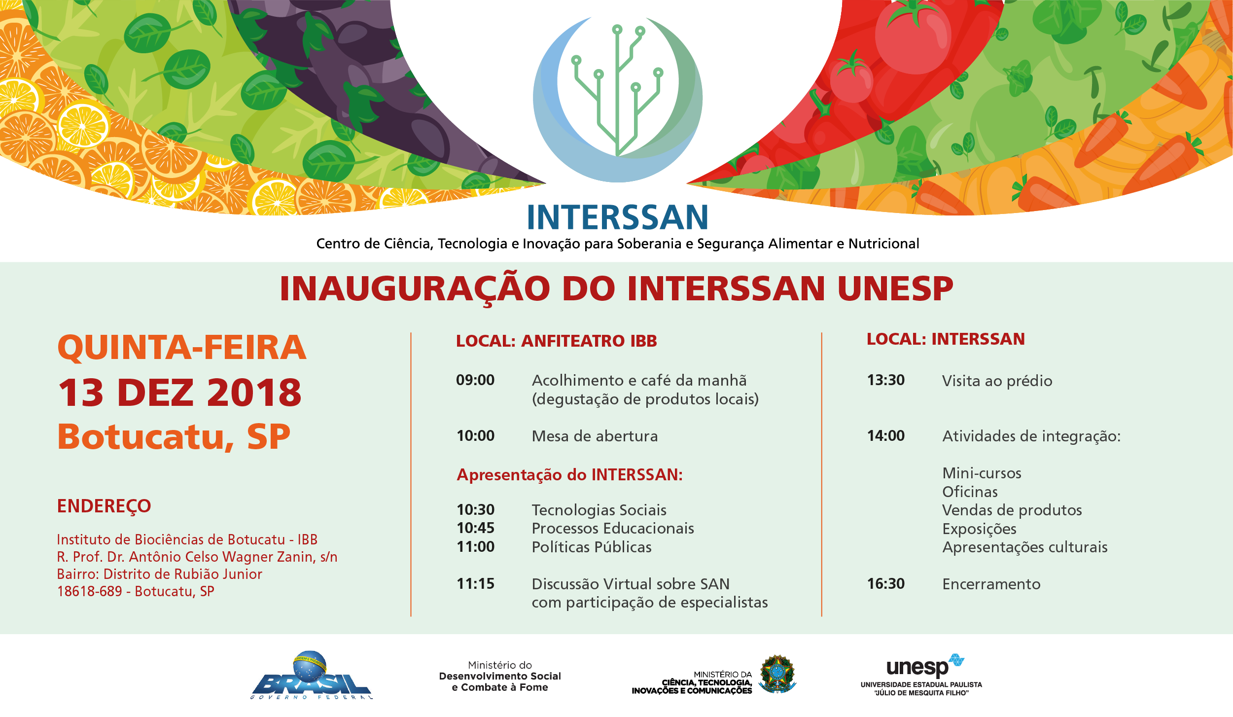 Botucatu ganhará a partir do próximo dia 13 deste mês o Centro de Ciência, Tecnologia e Inovação para Soberania Segurança Alimentar e Nutricional (INTERSSAN). A inauguração do prédio, construído no Instituto de Biociências da Unesp, câmpus Botucatu, contará com uma série de atividades que se iniciam a partir das 9 horas, no Espaço IB Eventos [veja programação abaixo]. O evento também será transmitido pelo Youtube [youtube.com/user/redesansbr].