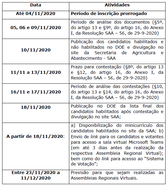 Conforme prorrogação através da Resolução SAA nº 63, de 28.10.2020 as inscrições para as eleições para a composição das CRSANS e do CONSEA/SP irão até o dia 4 de novembro de 2020.