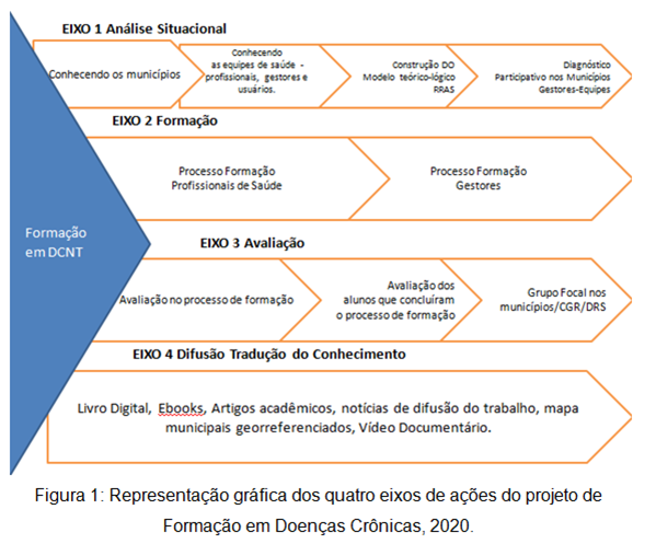 O projeto será desenvolvido através da execução de quatro eixos propostos, conforme apresentado na imagem abaixo. No Eixo 1 será realizado a Análise Situacional dos municípios e equipes do Estado; No Eixo 2 será realizado o processo de Formação, onde serão desenvolvidos e oferecidos um curso de extensão para os gestores (40h) e outro para profissionais de 525 equipes de saúde (180h); No Eixo 3 será desenvolvido o processo de Avaliação dos processos de formação; e no Eixo 4 será executado a Difusão/Tradução do Conhecimento através de publicação de matérias, artigos, e-books e desenvolvimento de webnários e vídeo-documentário.